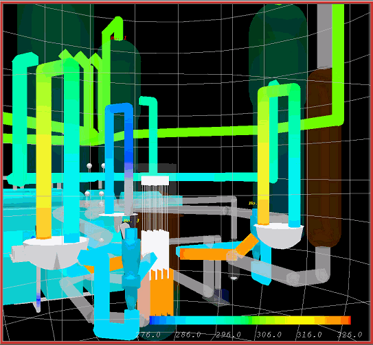 主要機器については、形状・状態量表示の切り替え、状態量データの取り込み、内部状態量の表示、透過・半透過表示の各種機能が与えられている。図はこれらの機能を活用した表示例である。蒸気発生器、加圧器は半透過表示となっており、内部の水位がわかる。圧力容器も半透過表示で、内部の炉心部、制御棒が見える。また、配管に沿っての温度分布の様子が色彩変化で表現されている。